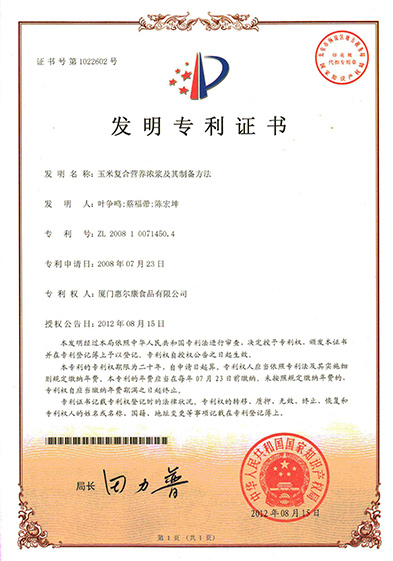 液态谷物杂粮制品的杀菌和灌装要领发明专利证书